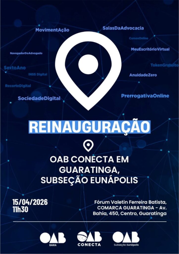 A Ordem dos Advogados do Brasil – Subseção Eunápolis segue avançando e convida toda a advocacia para a reinauguração do OAB Conecta em Guaratinga, com a presença confirmada da Presidente da OAB Bahia, Dra. Daniela Borges